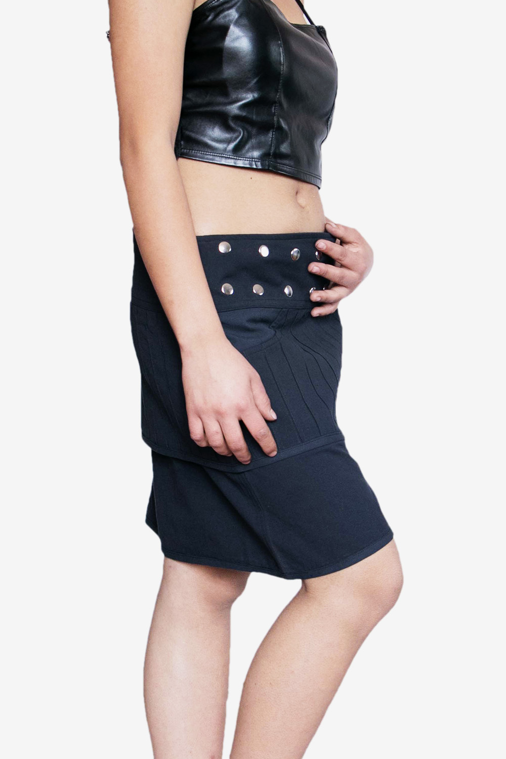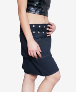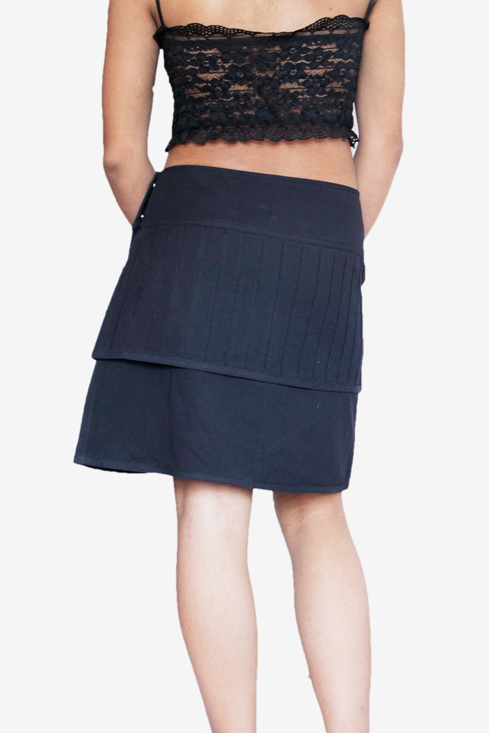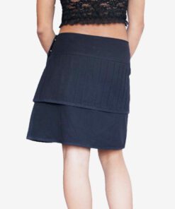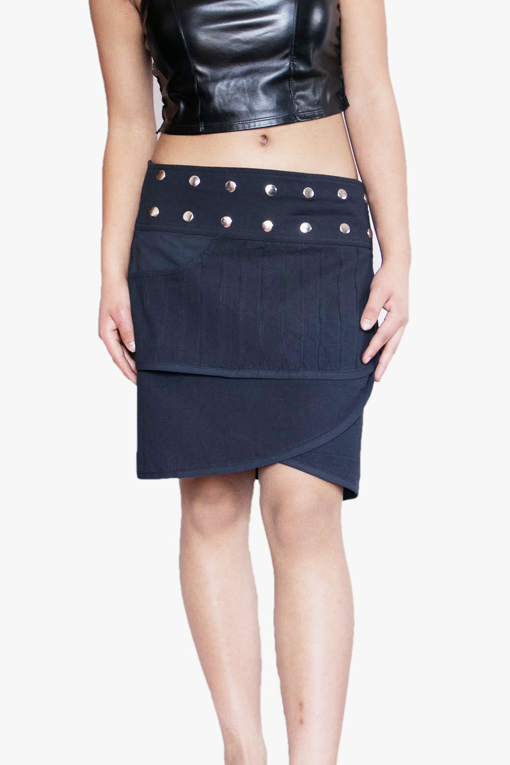 A stylish Layered Pin tuck Wrap Skirt featuring a crossover front and metallic grommet detailing. Made from soft, breathable fabric, it adds an edgy, modern touch to any outfit—perfect for festivals, casual wear, and street-style looks.